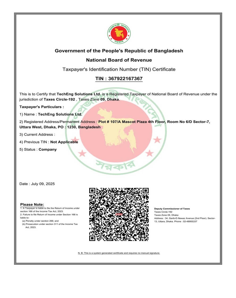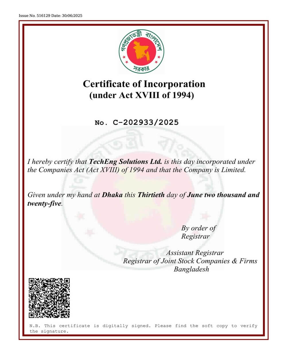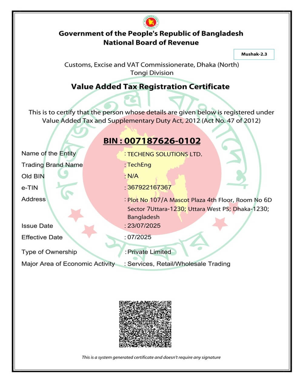 Our Certificates Trade LicenseTrade License showing the official business registration of TechEng Solutions Ltd. Certificate of IncorporationCertificate of Incorporation showing the official business registration of TechEng Solutions Ltd. Tax Indentification Number(TIN)Tax Identification Number(TIN) showing the official business registration of TechEng Solutions Ltd. Business Indentification Number(BIN)Business Identification Number(BIN) showing the official VAT and Business registration of TechEng Solutions Ltd.